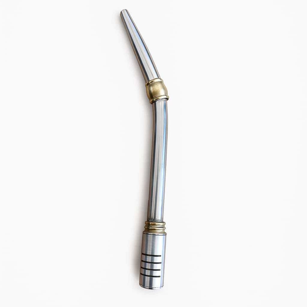 Bombilla de acero inoxidable de 14 cm de largo, resistente y duradera. Diseño curvo con boquilla cómoda, anillo de sujeción en tono dorado y base desmontable con ranuras que facilitan la filtración y limpieza. Ideal para mate, práctica e higiénica