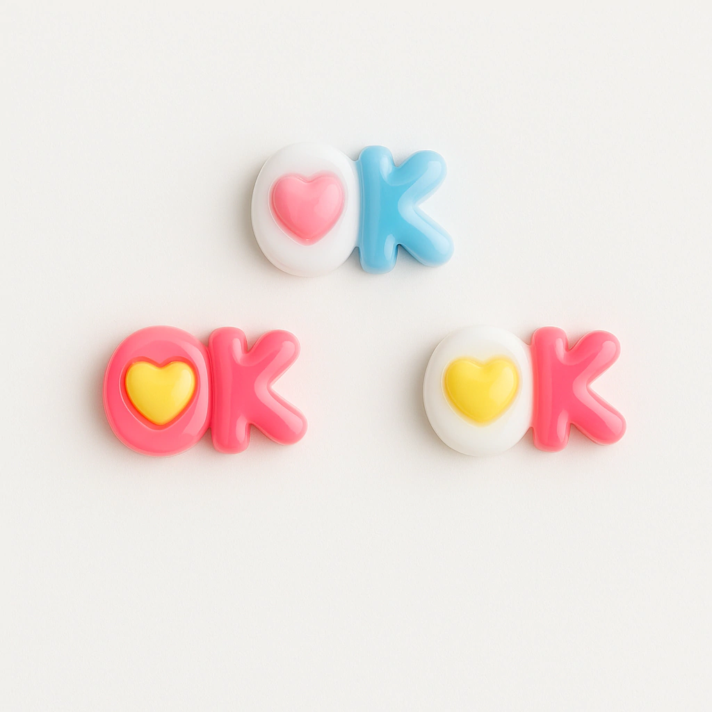 ¡Un detalle pequeño con mucha onda! Este set incluye 3 apliques de resina con la palabra “OK” en letras coloridas y un corazón en lugar de la “O”. Vienen en combinaciones pastel súper tiernas, ideales para decorar fundas, velas, clips, bijou, libretas o cualquier creación con un toque divertido y amoroso.